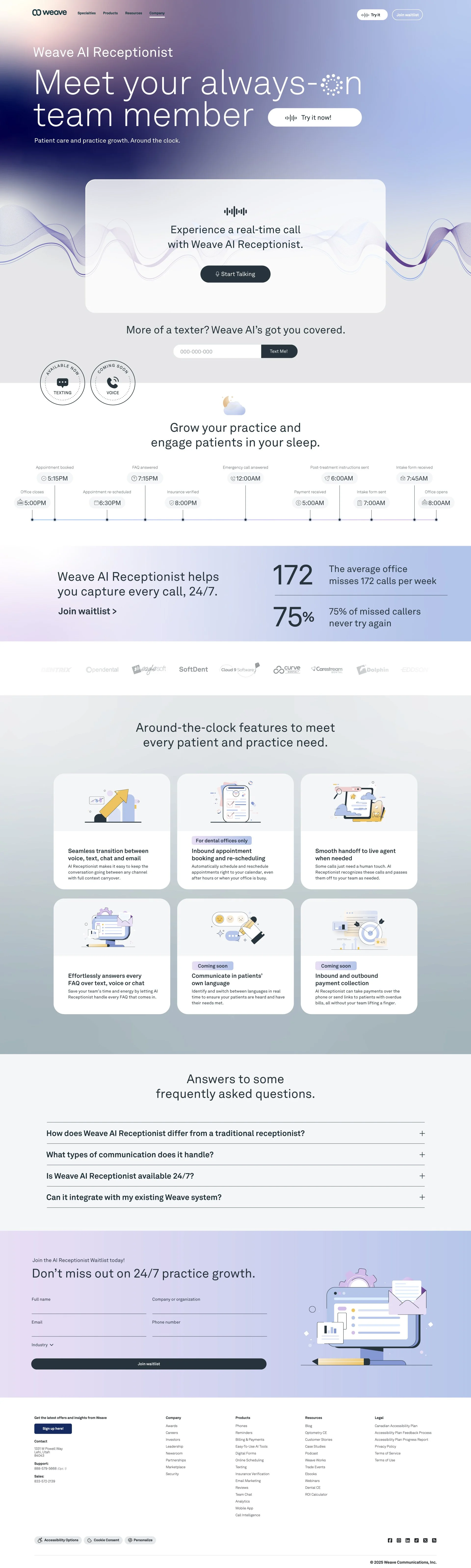 Designed to position Weave’s AI Receptionist as a true extension of the front desk—this landing page translates a complex product into a clear, approachable experience. The structure is built as a narrative system, using strong hierarchy, modular sections, and conversational pacing to guide users from curiosity to understanding. Every element works to reduce friction, build trust, and make the product feel intuitive, human, and ready to use.