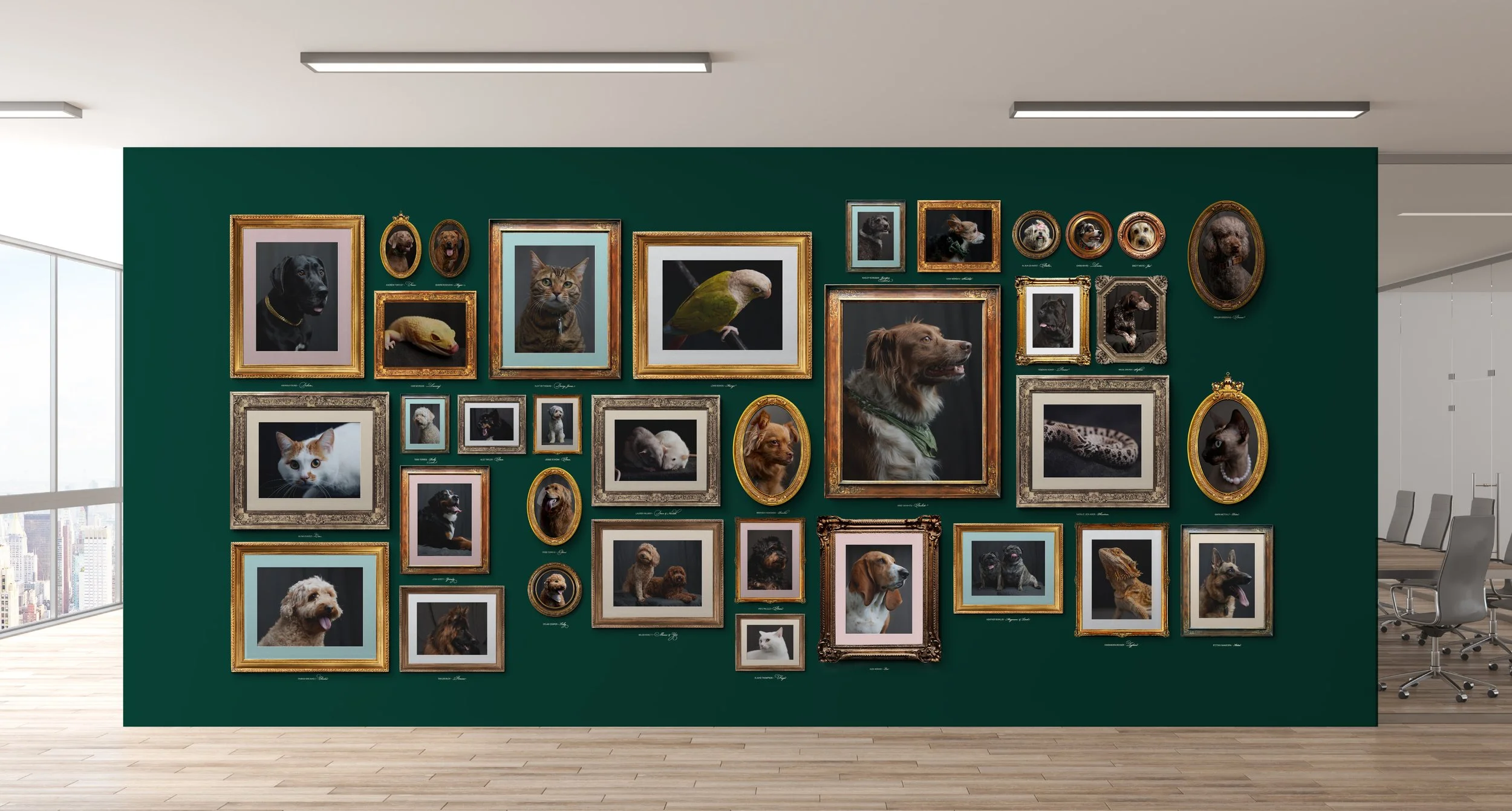 This environmental wall graphic installation at Weave headquarters honors the company’s longstanding partnership with veterinarians—one of its most valued customer groups. To celebrate this bond, Weave employees participated in a three-day photoshoot, capturing portraits of their beloved pets. These images were displayed in ornate, vintage-style frames, symbolizing the deep value pets bring to our lives. Set against a rich green backdrop, the installation blends warmth, nostalgia, and appreciation, reflecting Weave’s commitment to meaningful connections—both through technology and the love we share with our animals.